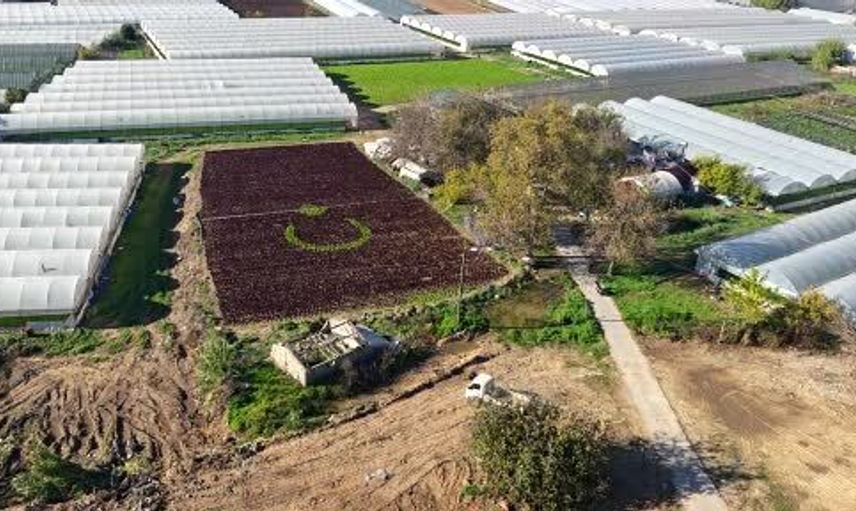 Antalya Muratpaşa ilçesi Zümrütova Mahallesi’nde iki üretici bir buçuk dönümlük arazide binlerce marulu özel bir düzenle dikerek Türk bayrağı deseni oluşturdu. Kırmızı yapraklı marulların arasına yerleştirilen açık yeşil kıvırcık marullarla verilen hilal ve yıldız formu, bölgeden geçenlerin yoğun ilgisini çekiyor.