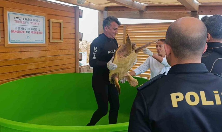 Antalya Lara sahilinde ağlara dolanmış halde bulunan Caretta caretta, deniz polisi tarafından kurtarıldı. Ekipler, kaplumbağayı ağlardan temizleyerek su yüzeyine çıkmasını sağladıktan sonra DEKAFOK görevlilerine teslim etti.