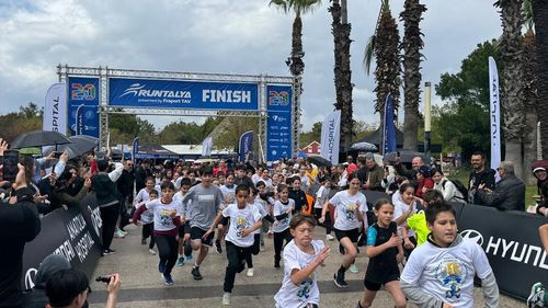 20. Uluslararası Runtalya Maratonu'nda 500 minik çocuk yağmur altında koşarak etkinliğe renk kattı.