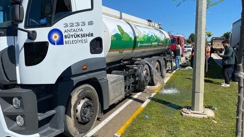 Antalya'nın Serik ilçesinde meydana gelen kazada tur minibüsü sulama tankerine çarptı, 6 kişi yaralandı.