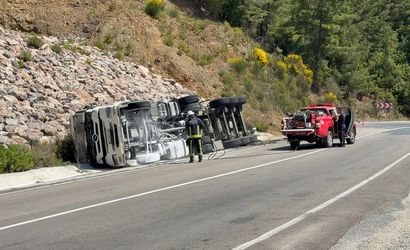 Antalya'nın Gazipaşa ilçesinde, zift yüklü tırın devrilmesi sonucu sürücü ağır yaralandı. Devrilen tırda çıkan yangın, itfaiye ekiplerince söndürüldü.