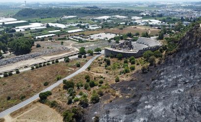 Antalya'nın Aksu ilçesinde, Kurşunlu Mahallesi'nde önceki gün çıkan ve Perge Antik Kenti sınırlarına yaklaşan ve büyük bölümü kızılçam ormanı olan yanan alanlar, dronla görüntülendi.