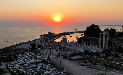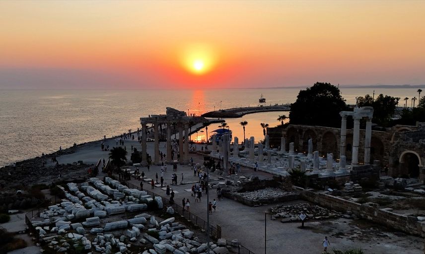 Antalya'nın Manavgat ilçesindeki tarihi Side Antik Kenti'nde yer alan Apollon Tapınağı, gün batımında sunduğu eşsiz manzarayla yerli ve yabancı turistlerin ilgisini çekiyor.