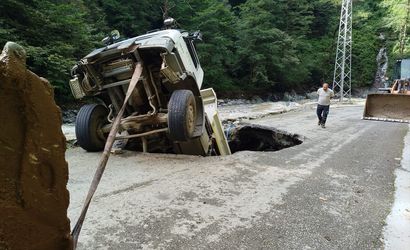 Artvin'in Arhavi ilçesinde, heyelan nedeniyle kapanan yolda yapılan onarım çalışmaları sırasında yolda meydana gelen çökme sonucu İl Özel İdaresi'ne ait bir kamyon oluşan çukura düştü.