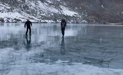 Artvin’de bir grup genç, Şavşat-Ardahan sınırındaki yaklaşık 3200 rakımlı Bülbülan Karagölünün tamamen buz tuttuğunu görünce göl yüzeyinde doyasıya eğlendi.