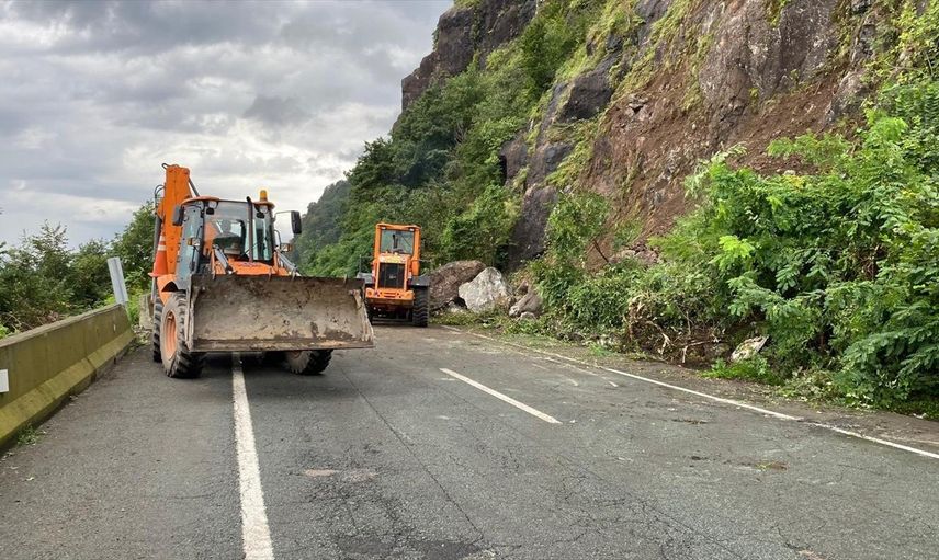 Bölgede bir süredir etkili olan yağışların ardından Hopa'ya bağlı Esenkıyı mevkiinde yamaçtan kopan kaya ve toprak parçaları yola sürüklendi.