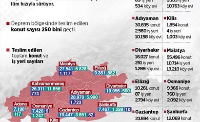 Asrın inşa seferberliğiyle deprem bölgesinde kalıcı konutların yapımının sürdürülmesi ve il il teslim edilen konut, iş yeri ve köy evlerine ilişkin infografik paylaşıldı. Buna göre teslim edilenler: