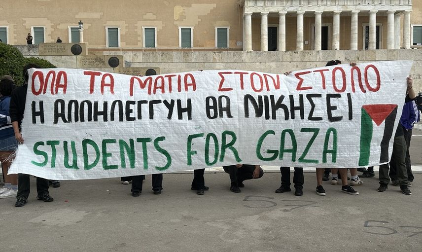 Yunanistan'ın başkenti Atina'da örgütlenen öğrenciler, Filistin'e destek ve Gazze'deki ablukayı kırmak için yola çıkan Küresel Sumud Filosu na dayanışma mesajı gönderdi. Genel grev kapsamında düzenlenen eylemde grup, parlamentonun önünde pankart açtı.