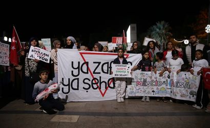 Çok sayıda vatandaş, ellerinde Türk ve Filistin bayraklarıyla Atatürk Kent Meydanı'nda toplandı. Katılımcılar, 'İsrail sivilleri hedef alıyor' ve 'Özgür Filistin' yazılı dövizler taşıdı, Filistin için ezgiler söylendi ve İsrail aleyhine sloganlar atıldı.