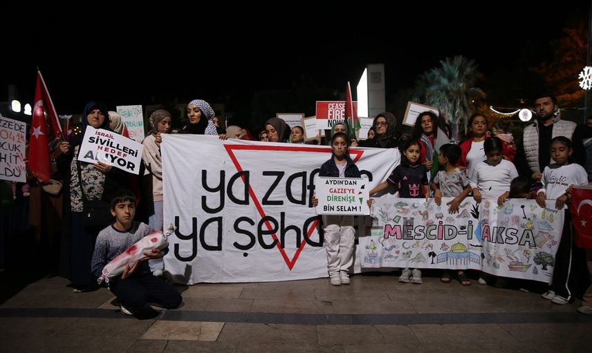 Aydın'da, İsrail'in Gazze'de 8 Ekim 2023'ten bu yana devam ettiği belirtilen soykırım ve Küresel Sumud Filosu'na yönelik saldırılar protesto edildi. Eylem, Aydın Sivil Dayanışma Platformu öncülüğünde gerçekleştirildi.