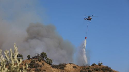 Aydın'ın Efeler ilçesi Pınardere Mahallesi'ndeki zeytinlik ve orman yangınına Orman İşletme Müdürlüğü ekipleri havadan ve karadan müdahale ediyor.