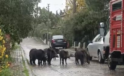 Balıkesir’in Ayvalık ilçesinde, kuvvetli yağışların etkili olduğu üçüncü günde aç kalan yaban domuzları ilçe merkezine indi.
