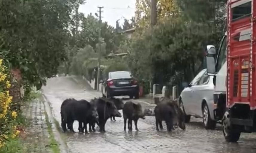 Yaban domuzlarının yiyecek arayışlarını vatandaşlar cep telefonlarıyla kaydetti; görüntüler kısa sürede sosyal medyada yayıldı.
