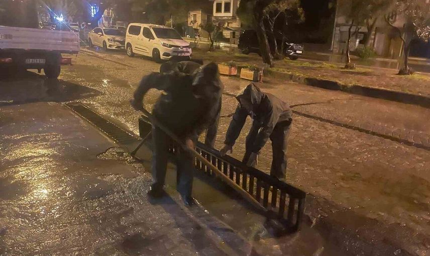 Ayvalık Belediyesi, 500’ü aşkın personel ile 24 saat sahada çalışarak su baskınlarının önüne geçmeye çalıştı. Tıkanan rögarları açmaya çalışan ekipler yoğun yağış altında mücadele etti.