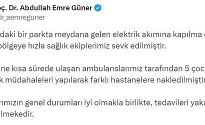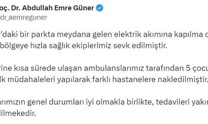 "Bağcılar’daki bir parkta meydana gelen elektrik akımına kapılma olayı üzerine bölgeye hızla sağlık ekiplerimiz sevk edilmiştir. Olay yerine kısa sürede ulaşan ambulanslarımız tarafından 5 çocuk gerekli ilk müdahaleleri yapılarak farklı hastanelere nakledilmiştir. Çocuklarımızın genel durumları iyi olmakla birlikte, tedavileri yakından takip edilmektedir" ifadelerini kullandı.