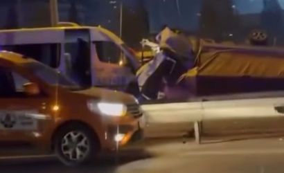 Bağcılar TEM Otoyolu Mahmutbey gişeler istikametinde saat 07.00 sıralarında, hafriyat kamyonu, kamyonet ve servis minibüsünün karıştığı zincirleme kaza meydana geldi.