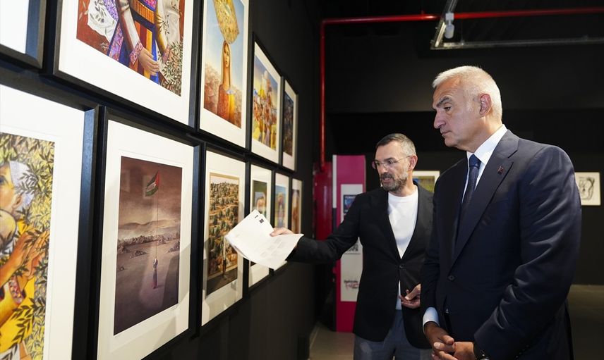 Kültür ve Turizm Bakanı Mehmet Nuri Ersoy, İstanbul Kültür Yolu Festivali kapsamında açılan ve Filistinli sanatçıların eserlerinden oluşan 'Hala Yaşıyorum' adlı resim sergisini Polat Piyalepaşa Çarşı'da gezdi.
