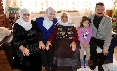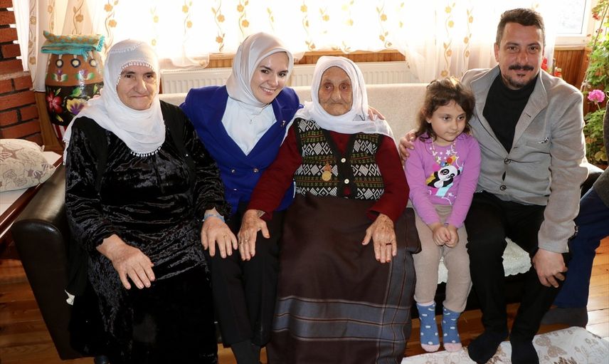 Aile ve Sosyal Hizmetler Bakanı Mahinur Özdemir Göktaş (solda), Gümüşhane'de yaşayan 113 yaşındaki Güllü Doğan (sağda) ile evinde bir araya geldi.