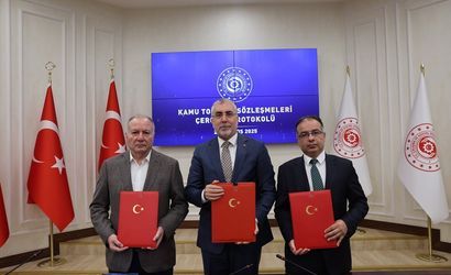 Kamu kurum ve kuruluşlarındaki 600 bine yakın işçiyi kapsayan 2025-2026 Kamu Toplu İş Sözleşmeleri Çerçeve Protokolü görüşmeleri uzlaşmayla sona erdi. Çalışma ve Sosyal Güvenlik Bakanı Vedat Işıkhan'ın (ortada) başkanlık ettiği toplantıya, TÜHİS Genel Sekreter Yardımcısı Şerafettin Güler (sağda) ile TÜRK-İŞ Genel Başkan Yardımcısı Ramazan Ağar (solda) da katıldı.