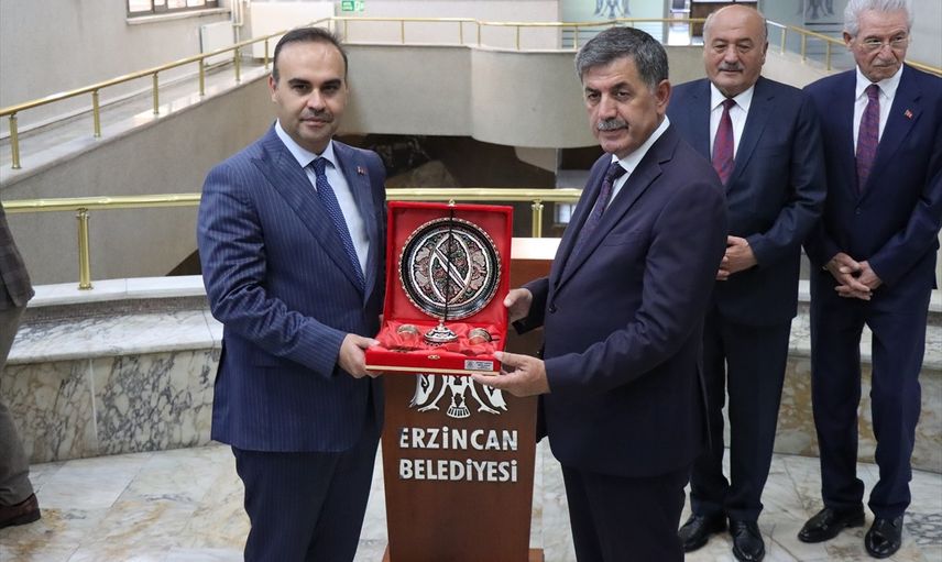Sanayi ve Teknoloji Bakanı Mehmet Fatih Kacır (solda), Erzincan Belediye Başkanı Bekir Aksun'u (sağda) ziyaret etti.