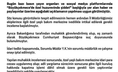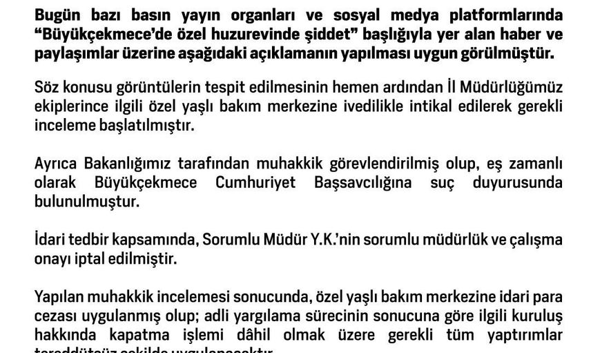 Aile ve Sosyal Hizmetler Bakanlığı, bazı basın yayın organları ve sosyal medya platformlarında yer alan 'Büyükçekmece’de özel huzurevinde şiddet' başlıklı haber ve paylaşımlara ilişkin yazılı bir açıklama yayımladı.