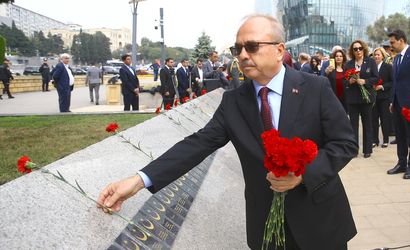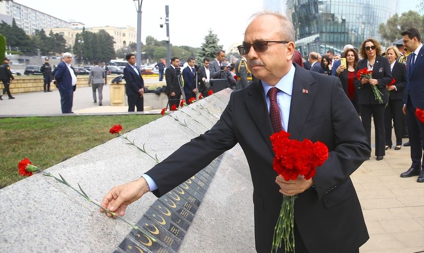 Büyükelçi Birol Akgün'ün Şehitlik Anıtı'na çelenk sunduğu törende, şehitler anısına saygı duruşunda bulunuldu. Ardından Azerbaycan Savunma Bakanlığı Askeri Bandosu eşliğinde İstiklal Marşı ile Azerbaycan Milli Marşı seslendirildi.