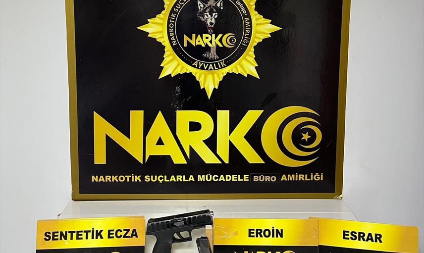 Ayvalık Narkotik Suçlarla Mücadele Büro Amirliği ekipleri şüphe üzerine bir aracı durdurdu. Yapılan aramalarda araçta ve 3 şüphelinin üzerinde 18 gram eroin, 2 adet sentetik ecza maddesi, 0,49 gram esrar, ruhsatsız tabanca ile bu tabancaya ait mermiler ve fişek ele geçirildi.