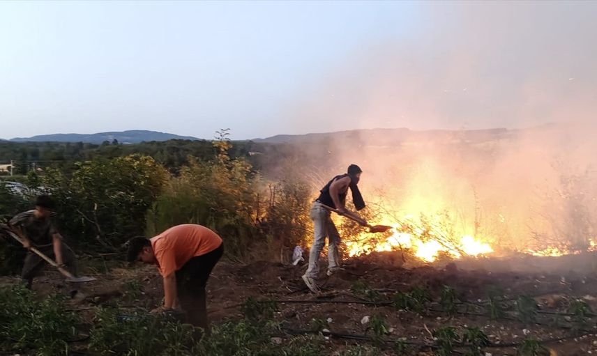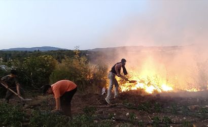 Balıkesir'in Savaştepe ilçesinde, tavuk çiftliğinde başlayıp ormanlık alana sıçrayan yangına müdahale ediliyor. Vatandaşlar da küreklerle alevlerin üzerine toprak atarak söndürme çalışmalarına destek veriyor.