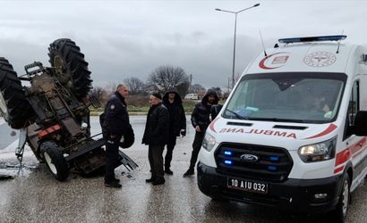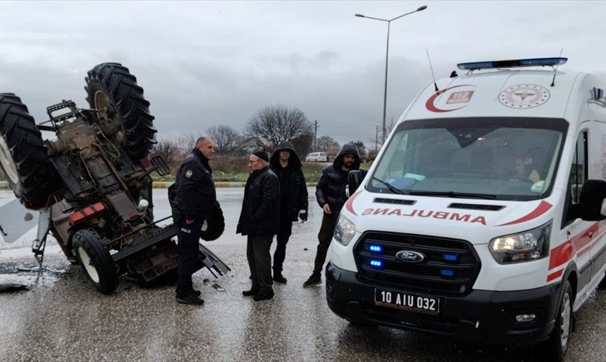Balıkesir'in Savaştepe ilçesinde traktör ile otomobil çarpıştı. Çarpışmanın etkisiyle ters dönen traktörün sürücüsü yaralandı. İhbar üzerine bölgeye polis ve sağlık ekipleri sevk edildi.