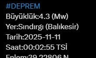 AFAD’ın paylaştığı bilgilere göre, Balıkesir’in Sındırgı ilçesinde saat 00.02'de 4.3 büyüklüğünde deprem kaydedildi. Depremin derinliği 7 kilometre olarak ölçüldü.