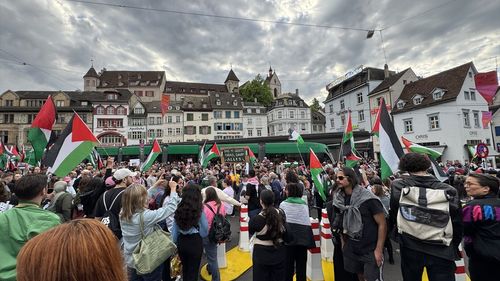 Basel'de toplanan binlerce kişi, İsrail'in Eurovision'a katılımını ve Gazze'deki soykırımı protesto etti.