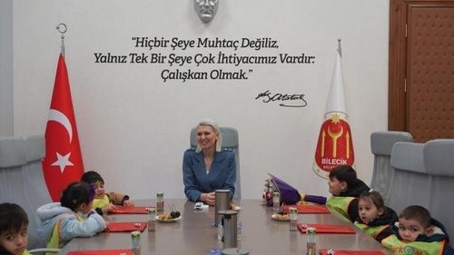 Bilecik Belediye Başkanı Melek Mızrak Subaşı, Özel Türkoğlu kreşi öğrencileri ve öğretmenlerini belediyede kabul ederek sorularını yanıtladı ve toplu fotoğraf çektirdi.