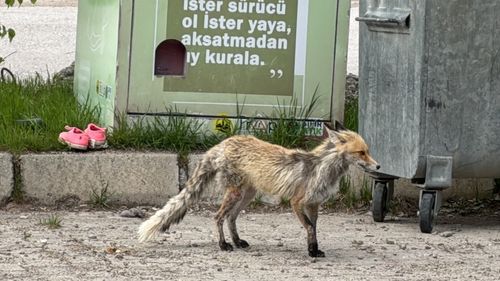 Bayburt'ta şehir merkezine inen bir tilki, Kaleardı Mahallesi'nde yiyecek ararken görüntülendi.