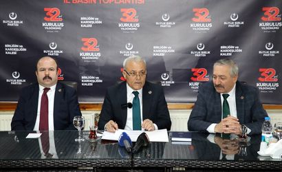Büyük Birlik Partisi (BBP) Genel Başkan Yardımcısı Fehmi Güney (ortada), Amasya'daki bir restoranda düzenlediği basın toplantısında, Van Büyükşehir Belediye Başkanı Abdullah Zeydan'ın Diyarbakır'da yargılandığı davada 3 yıl 9 ay hapis cezasına çarptırıldığını hatırlattı.