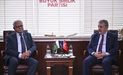 Büyük Birlik Partisi (BBP) Genel Başkanı Mustafa Destici (sağda), Pakistan'ın Ankara Büyükelçisi Yusuf Cüneyd (solda) ile BBP Genel Merkezi'nde bir araya geldi.
