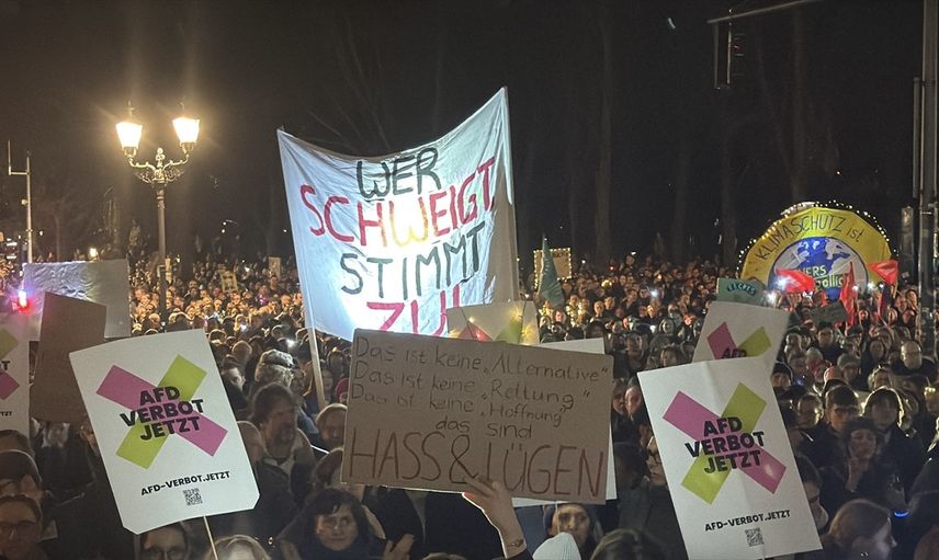 Aşırı sağcı popülist Almanya için Alternatif (AfD) partisine karşı duyulan tepki, gösteride ön plana çıktı. Katılımcılar, üzerinde “AfD’ye kırmızı kart”, “Demokrasi”, “İnsanlık için kayıt olun”, “Sessiz kalan onaylar”, “Nefret, kışkırtma ve ırkçılığa karşı”, “AfD yasağı şimdi” ve “Duruşunuzu gösterin” yazılı döviz ve pankartlar taşıdı.