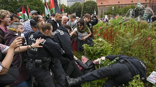 Berlin'deki Filistin destek eyleminde polis, göstericilere sert müdahalelerde bulundu ve çok sayıda gözaltı gerçekleştirdi.