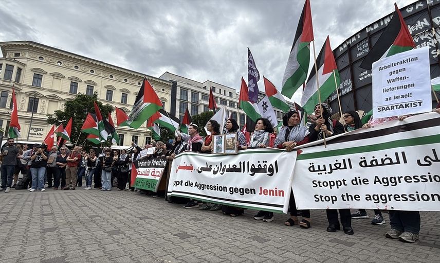 Etkinlikte yapılan konuşmalarda, Almanya’dan İsrail’e silah tedarik etmeyi bırakması ve Filistin halkına destek vermesi talep edildi.