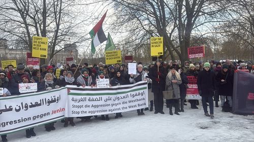 Berlin'de düzenlenen Filistin destek gösterisinde, Gazze'ye yönelik saldırılar protesto edildi, Almanya'nın silah tedariki eleştirildi.