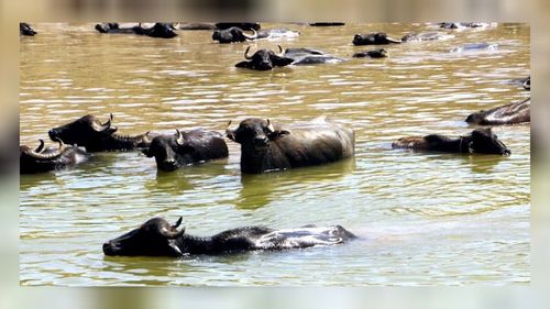 Aşırı sıcak geçen Kurban Bayramı’nda bir besici, bunalan mandalarını dereye sokarak serinletti.