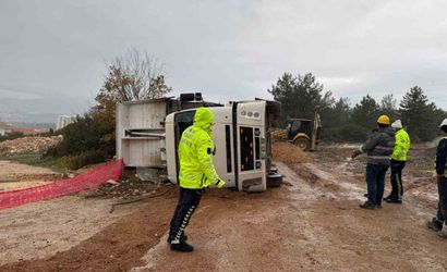 Bilecik merkez Bahçelievler Mahallesi Arabacı Sokak üzerindeki hafriyat dökme sahasında, Cemil E. idaresindeki 07 BTH 959 plakalı hafriyat yüklü kamyon, damperi boşaltırken devrildi.