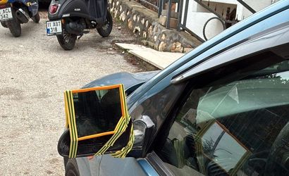 Bilecik'te Ertuğrulgazi Mahallesi Yediler Caddesi üzerinde bir sürücü, kırılan sol dikiz aynası yerine evlerde kullanılan küçük bir aynayı lastik bir iple bağlayarak çare buldu.