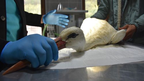 Osmaneli'de elektrik tellerine çarpan leylek, hayvan barınağında tedavi ediliyor. Sağlık durumu iyiye gidiyor.