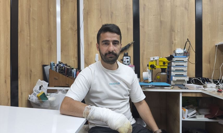 Bingöl’ün Solhan ilçesindeki iş yerinde cep telefonu tamiri yapan Enes Akgül, müşterisinin getirdiği arızalı telefonu incelerken telefonun bataryası patladı. Olay sonucu elinde hafif derecede yanık oluşan Akgül (fotoğrafta), AA muhabirine açıklama yaptı.