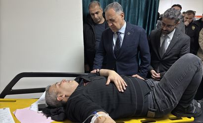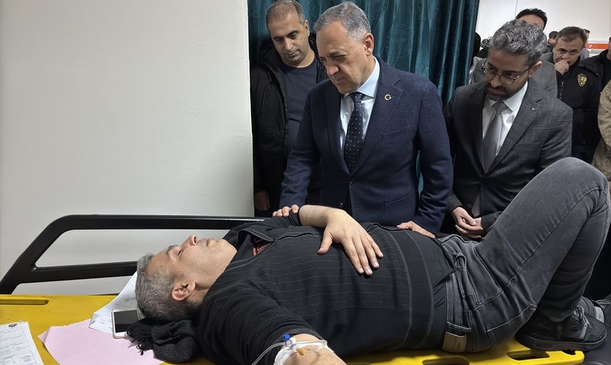 Bingöl'de yolcu otobüsünün devrilmesi sonucu 2 kişi hayatını kaybetti, 17 kişi yaralandı. Vali Ahmet Hamdi Usta (sağ 2), İl Sağlık Müdürü Uzman Dr. Samet Tatlı (sağda) ile Bingöl Devlet Hastanesi'nde tedavi gören yaralıları ziyaret etti.