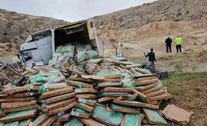 Bitli’in Adilcevaz-Erciş karayolunda Adana'dan Özbekistan'a giden tavuk eti yüklü tırın devrilmesi sonucu sürücü yaralandı, koliler ve etler çevreye dağıldı.