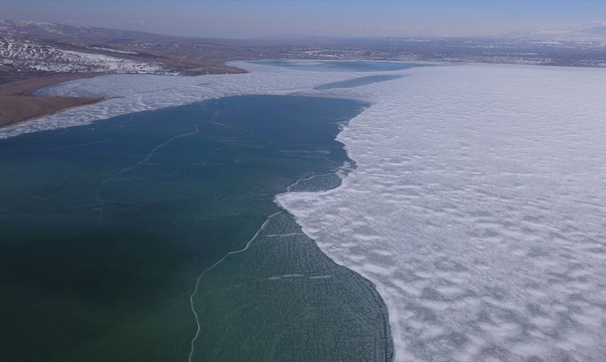 Bitlis'in Ahlat ilçesinde kışın yüzeyi donan Nazik Gölü'nde buzlar kısmen eridi.