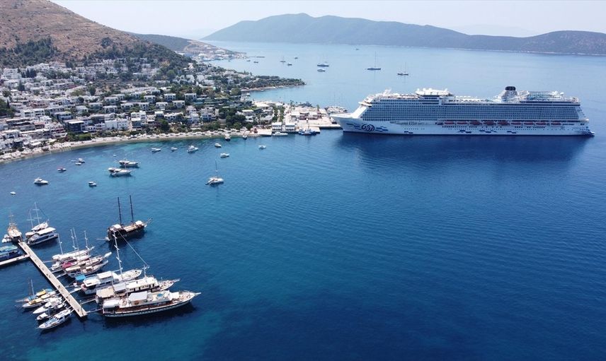 Muğla'nın Bodrum ilçesine ilk kez gelen AROYA Cruises, yolcularını, bando ve halk oyunları ekibiyle karşıladı. Kırmızı halı serilen girişte, misafirlere yerel ürünlerden oluşan lezzetler sunuldu.