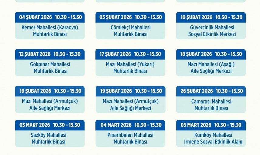 Projenin ilk durağı Mumcular, Gölbaşı ve Karaova mahalleleri olacak. 27-28 Ocak 2026 tarihlerinde, 10.30 ile 15.30 saatleri arasında Mumcular Düğün Salonu'nda Mumcular, Gölbaşı ve Karaova mahalle sakinleri "Gezen Tartı" hizmetinden faydalanabilecek.
