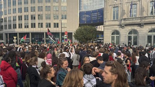 Brüksel'de yüzlerce kişi, İsrail'in Küresel Sumud Filosu'na yönelik saldırısını protesto ederek Dışişleri Bakanlığı önünden AP önü Lüksemburg Meydanı'na yürüdü.